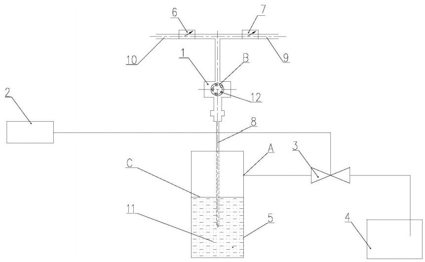 儲(chǔ)液器,其內(nèi)承裝有液體,儲(chǔ)液器上具有入口;裝球室,其內(nèi)具有容置膠球的腔體連通管路,其與裝球室連通,并自裝球室延伸至儲(chǔ)液器內(nèi)的液體液面以下;進(jìn)球管路,其與裝球室連通;出球管路,其與裝球室連通;壓力介質(zhì)供給裝置,其通過(guò)管路與儲(chǔ)液器的入口連接,以向儲(chǔ)液器內(nèi)輸送壓力介質(zhì)。