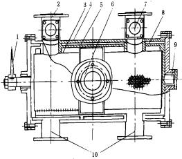 膠球清洗技術(shù)是20世紀80年代發(fā)展起來的冷卻器清洗技術(shù),先在熱電行業(yè)冷卻水系統(tǒng)中使用,它需要膠球清洗泵及膠球收、放的旁路設備,系統(tǒng)較復雜。在試驗的基礎上研制出的一種用于冷卻器的新型膠球在線清洗器,其結(jié)構(gòu)見圖1。它具有水流定向切換和特殊的膠球收、放機構(gòu),可利用循環(huán)水的系統(tǒng)動力實現(xiàn)在線清洗。