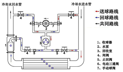 冷凝器清洗適合選全自動在線膠球清洗裝置安裝指導:在冷卻水循環(huán)管路上,加裝由發(fā)球器、收球器、控制器等管路系統(tǒng)組成的旁路,通過發(fā)球器將膠球注入冷凝器內,在系統(tǒng)自有壓力的作用下,對冷凝器銅管內壁的污垢進行自動清洗,在出水口端由收球器將膠球濾回至發(fā)球器,形成一次完整的清洗循環(huán)。通過控制系統(tǒng)可設定清洗頻率,實現(xiàn)自動在線清洗功能,使冷凝器銅管內壁始終處于清潔狀態(tài),提高了換熱效率,并降低了能耗,從而達到節(jié)約能源的目的。