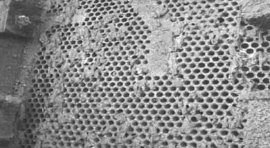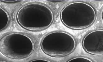 1)蒸發(fā)器前7效(尤其第1效)上部銅管表面附著有一層均勻的水垢沉積物,見圖1,厚度約0.5mm,底部銅管表面附著一層較厚的硬質水垢沉積物,部分區(qū)域形成水垢掛體并塞滿換熱管縫隙,不銹鋼內(nèi)壁附著一層水垢掛體,部分區(qū)域厚度達到10mm,垢樣分析主要成分為硫酸鈣,并有部分碳酸鈣;