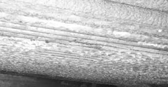 2)末效鈦管內(nèi)有薄薄的一層水垢沉積物,并有黏泥雜質形成的沉積物,以及藻類、貝類等雜物,垢樣分析主要成分為碳酸鈣,見圖2。