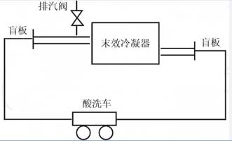 末效的清洗先用高壓水槍沖洗黏泥以及藻類、貝類等雜物,再采用酸洗,以除去碳酸鈣垢,清洗劑選用鹽酸。末效冷凝器將蒸發(fā)器末效進出口1m彎頭拆掉,在法蘭處增加盲板,在盲板上連接DN100管道,管道與酸洗車進出口進行連接,構成循環(huán)酸洗回路,見圖8。首先加入緩蝕劑,調(diào)整清洗液pH值至1.5左右,在酸洗過程中,為了防止過洗現(xiàn)象,要求不斷注入鹽酸,保持pH值在1~2之間。在開始階段,由于鹽酸與碳酸鈣劇烈反應,消耗大量的鹽酸,15min后,pH值升值2.6左右,隨著鹽酸的不斷注入,pH值逐漸呈下降趨勢。第345min時,pH值下降至最低點1.35,停止注入鹽酸,隨后pH值略為上升,最后穩(wěn)定在1.5左右,說明酸洗終點達到。在整個酸洗過程中,總硬不斷上升,最終達到850mg/L左右,并且長時間保持穩(wěn)定,時間正好與pH值終點吻合,從另一方面說明酸洗終點達到!
