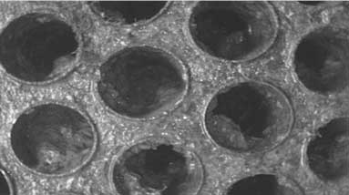 凝汽器膠球清洗裝置中前7效清洗時,首先采用酸洗,以除去硫酸鈣以外的大部分水垢,考慮到銅鋁合金管壁較薄,且垢層厚薄不均勻,需要選擇腐蝕性小,又有較好的清洗效果的酸性清洗劑,所以酸洗清洗劑選擇氨基磺酸。其后采用中性清洗劑進行螯合清洗,該清洗劑主要包含螯合劑、表面活性劑、聚合物,對垢表面潤濕、滲透,改變垢晶體結構,使垢膨化疏松,便于通過水流攜帶出系統(tǒng)。前7效采用蒸發(fā)器自身的循環(huán)系統(tǒng)進行清洗。首先在循環(huán)清洗液中加入銅緩蝕劑,由于銅緩蝕劑呈堿性,所以循環(huán)清洗液呈堿性。隨后不斷地向系統(tǒng)中注入淡化水,以增大循環(huán)水量,由于淡化水呈弱酸性,所以循環(huán)清洗液pH值逐漸降低,直至接近淡化水的pH值(約6左右)。此時階段循環(huán)清洗液中的總硬較平穩(wěn),在200mg/L左右。第230min時,開始向系統(tǒng)中注入710清洗劑,由于710清洗劑是一種復合型有機酸類清洗劑,清洗機理主要是通過與無機鹽、金屬氧化物等形成螯合物。故在加入710后,其首先與清洗液中的鈣離子反應,使清洗液中的鈣離子逐漸降低,直至為零。第320min時,開始向系統(tǒng)中注入氨基磺酸,pH值迅速下降,第375min時,降低至1.5,停止注酸。隨著氨基磺酸的注入,碳酸鈣垢開始分解,清洗液中的Ca2+濃度迅速增大,由于碳酸鈣垢分解消耗了大量的酸,pH值也迅速上升。第400min時,清洗液中的總硬達到1150mg/L,pH值上升至4.5,并再次向系統(tǒng)中注入氨基磺酸。隨著酸的注入,pH值再次迅速下降,總硬繼續(xù)上升。第415min時,pH值下降至1.5,停止注酸。第435min時,總硬1450mg/L,pH值略上升至1.7,此后,總硬、pH值相對平穩(wěn),說明清洗終點到達,停止酸洗。酸洗前后的結垢情況,見圖4、圖5。