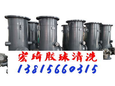 我公司生產(chǎn)的凝汽器膠球清洗裝置,適用于50~600MW汽輪機發(fā)電機組,膠球清洗裝置主要由膠球泵、收球網(wǎng)、裝球室、電控柜以及附屬件等設(shè)備組成。其工作原理是:膠球泵啟動,借助水流的作用將直徑大于冷凝管內(nèi)徑的海綿膠球擠進凝汽器冷凝管,經(jīng)收球網(wǎng)收球再進入裝球室。通過這一過程,膠球?qū)淠苓M行清洗,維持冷凝管內(nèi)壁清潔,保證凝汽器設(shè)計換熱效率不下降,從而維持凝汽器的端差和汽輪機背壓;同時避免冷凝管內(nèi)壁腐蝕,改善運行條件,延長機組壽命。