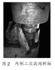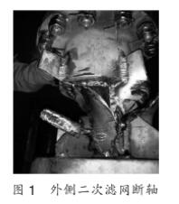 (1)膠球清洗二次濾網(wǎng)動力軸和排污斗短軸直徑90mm,軸頸過小,在連續(xù)旋轉(zhuǎn)過程中膠球清洗二次濾網(wǎng)受水流沖擊較大,在運(yùn)行過程中共出現(xiàn)6次動力軸和短軸斷裂事故,如圖1和圖2所示。
