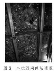 (3)膠球清洗二次濾網(wǎng)網(wǎng)芯孔徑過小,僅為中8mm,運(yùn)行過程中垃圾極易造成網(wǎng)芯的堵塞(圖3)。在夏季垃圾.較多時期,每臺膠球清洗二次濾網(wǎng)平均每兩.周需要清理一次。當(dāng)膠球清洗二次濾網(wǎng)隔離人工清理時,凝汽器鈦管水側(cè)出現(xiàn)斷水,在凝汽器汽側(cè)汽流沖擊下?lián)Q熱管束的振動增大,造成管束和管板間磨損。另外,隔離時鈦管會出現(xiàn)溫度升高現(xiàn)象,致使鈦管膨脹加長。由于兩側(cè)管板間距變化較小,鈦管膨脹加長后會產(chǎn)生拱起彎曲,與管隔板間的磨損加劇。上述因素極易造成鈦管的磨損穿孔,致使凝汽器出現(xiàn)泄漏,影響機(jī)組整個汽水系統(tǒng)的安全。