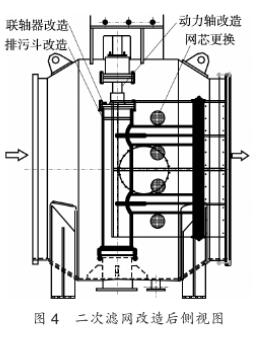 (②動力軸改造。將原來的膠球清洗二次濾網(wǎng)動力軸(上軸)更改為雙相不銹鋼材質(zhì)的軸,軸徑由目前的90mm改造為120mm,軸受剪切力F=3.14rσ,其中,σ為屈服強(qiáng)度,r=中/2。經(jīng)過計算,新軸剪切力.約為原軸的1.8倍。軸與減速箱連接尺寸不變。