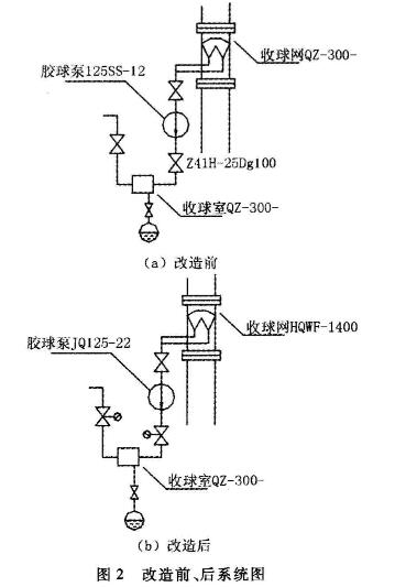 膠球清洗裝置改造前、后系統(tǒng)圖見圖2。