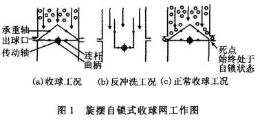 球網(wǎng))與平面鉸鏈四桿機構(gòu)組合起來,構(gòu)成新的旋擺自鎖式收球網(wǎng),實現(xiàn)了收球和網(wǎng)板反沖洗工況,并確保在收球工況網(wǎng)板與筒體密合無漏球現(xiàn)象。