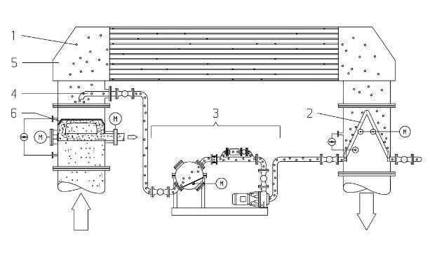 1、清洗球;2、收球器;3、循環(huán)單元;4、注球管;5、冷凝器/熱交換器;6、二次濾網(wǎng)。