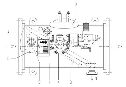 1收球器殼體;6收球網(wǎng)觀察孔;7驅(qū)動(dòng)機(jī)構(gòu);3導(dǎo)流板N出球管管口;4軸承+/-壓差測量系統(tǒng)接口;5網(wǎng)板半橢圓形收球網(wǎng);5將膠球引至出球管管口N。
